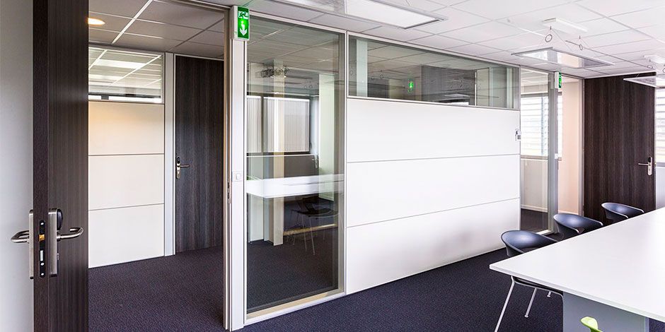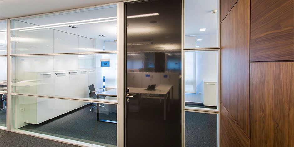 Our framed glass wall system allows for multiple configurations and better acoustics. Available options of glass walls with transom and tile framed glass walls.